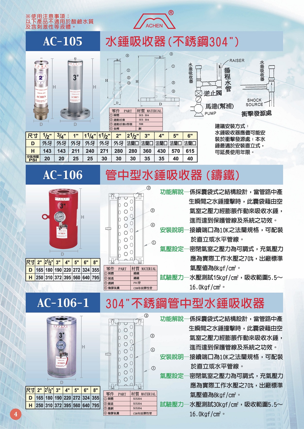AC-106-1 304"不銹鋼管中型水錘吸收器